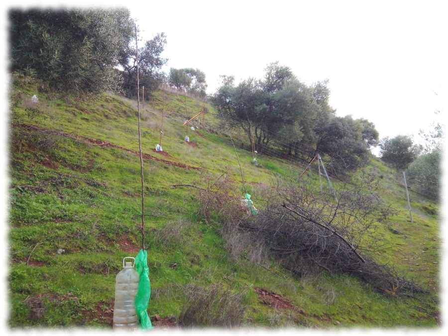 La tarea que acabo de concluir es la inserción del bosque comestible elemental, la primera fase, habiendo sembrado hasta el momento casi medio centenar de olivos lechines (variedad autóctono resistente y con un aceite exquisito), casi medio centenar también de frutales variados (melocotoneros, perales, manzanos, caquis, naranjos, nogales, castaño, moreos, granados, kiwis, groselleros, almendros…) zonificando los espacios según los requerimientos de cada especie.