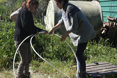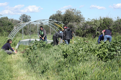 Mientras tanto, otro grupo cortaba tubo para hacer un pequeño invernadero para uno de los bancales.