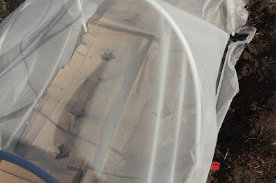 Así quedó. El invernadero se cubrió con la manta térmica que he estado usando este invierno, que está ya muy rota, en el lado derecho y con tul de ese que sirve para hacer tutús de bailarinas, en el lado izquierdo. Quiero probar diferentes tipos de telas para ver si puedo sustituir la manta térmica por algo más barato, duradero y sostenible.