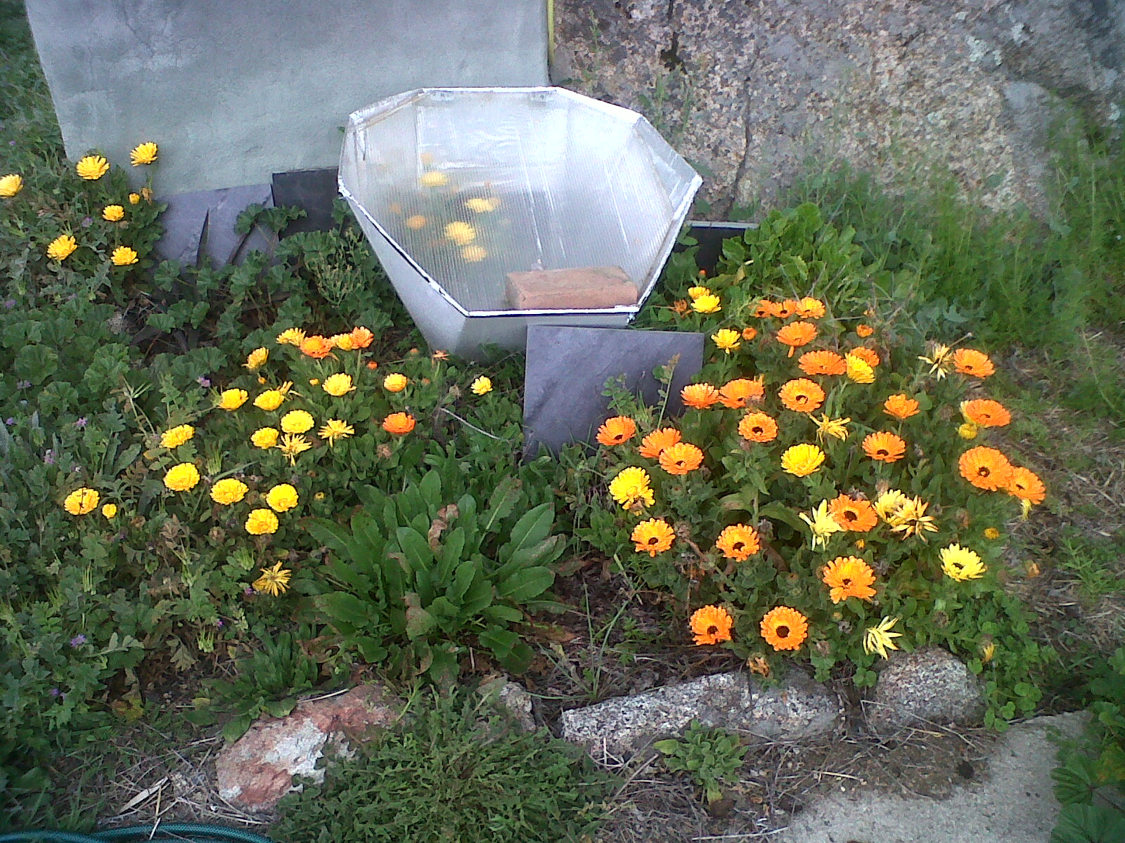 Me gusta pensar en este rinconcito como el sitio de la piel, porque en él he plantado aloes y caléndula, que son plantas medicinales muy buenas para la piel. Las caléndulas están felices y florecen como locas, incluso, si os fijáis, dentro del horno solar.