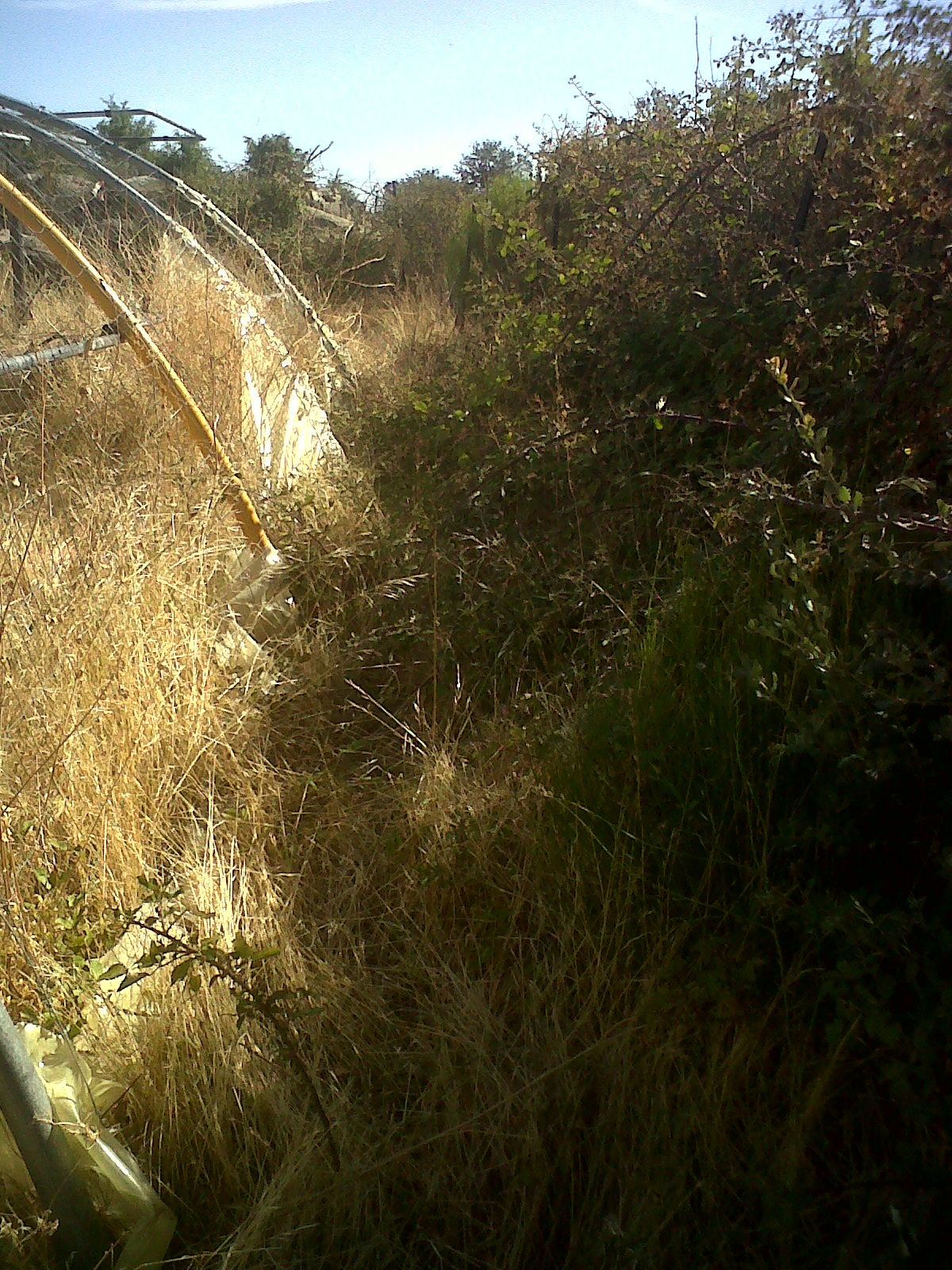 Es muy divertido quitar trocitos de plástico toda la mañana, eso sin contar los extraños alambres que aparecen por todas partes, sin que se comprenda muy bien cuál podía ser su función. También hay que quitar la malla tipo valla que rodea el asunto y que probablemente contribuyó a rajar el plástico hasta destrozarlo (que es como lo encontramos al llegar hace tres años).