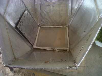 Un amigo (¡Hola, Javier!) lo hizo él mismo y me lo regaló el verano pasado. Está construido de tal forma que el fondo se puede retirar fácilmente y en cuanto lo vi pensé que se podría usar como concentrador de rayos solares para alguna planta que guste del calor.